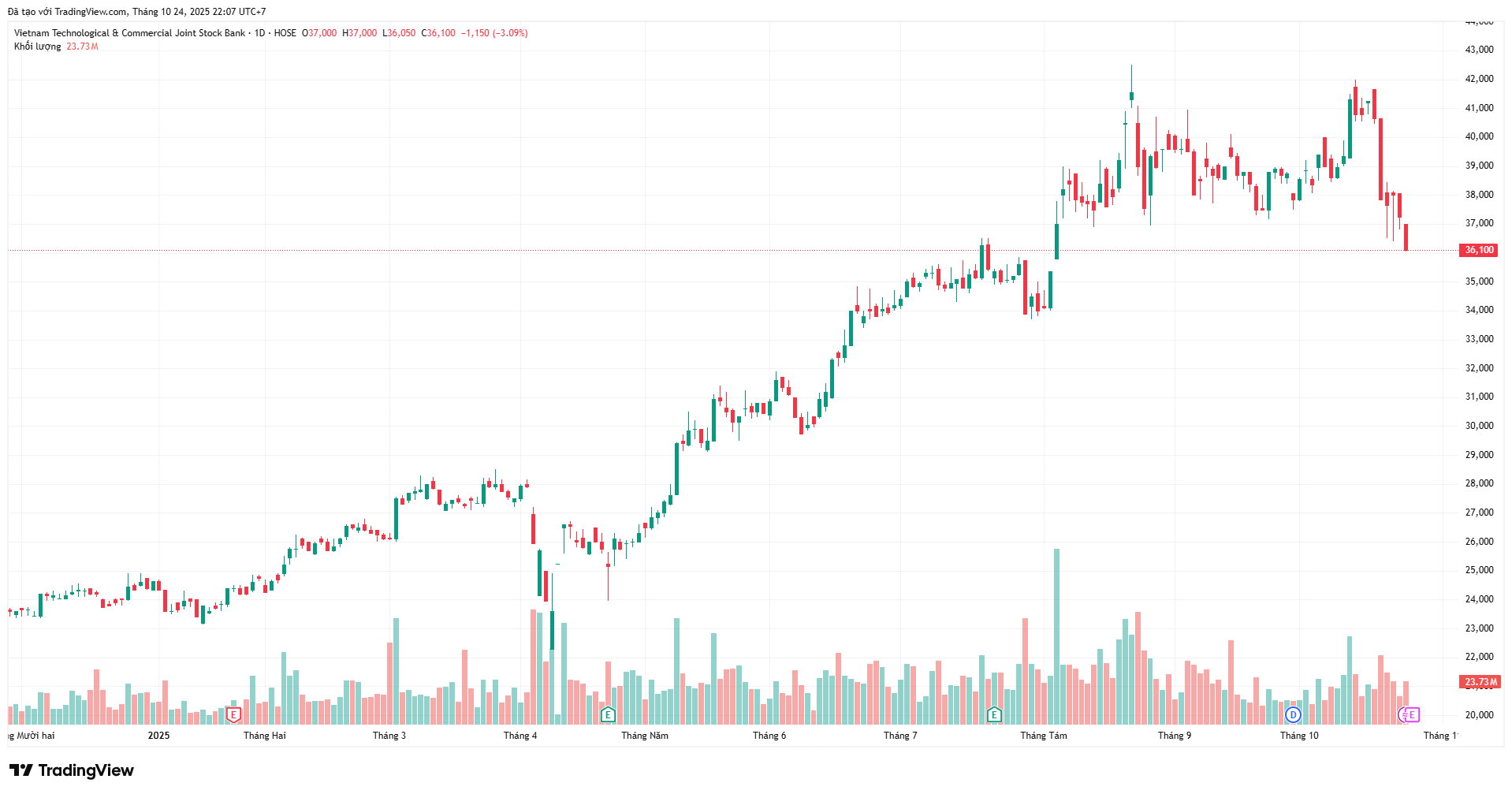 Kết thúc phiên giao dịch ngày 24/10, giá cổ phiếu TCB của Techcombank ở mức 36.100 đồng/cổ phiếu, tăng gần 36 % so với đầu năm.
