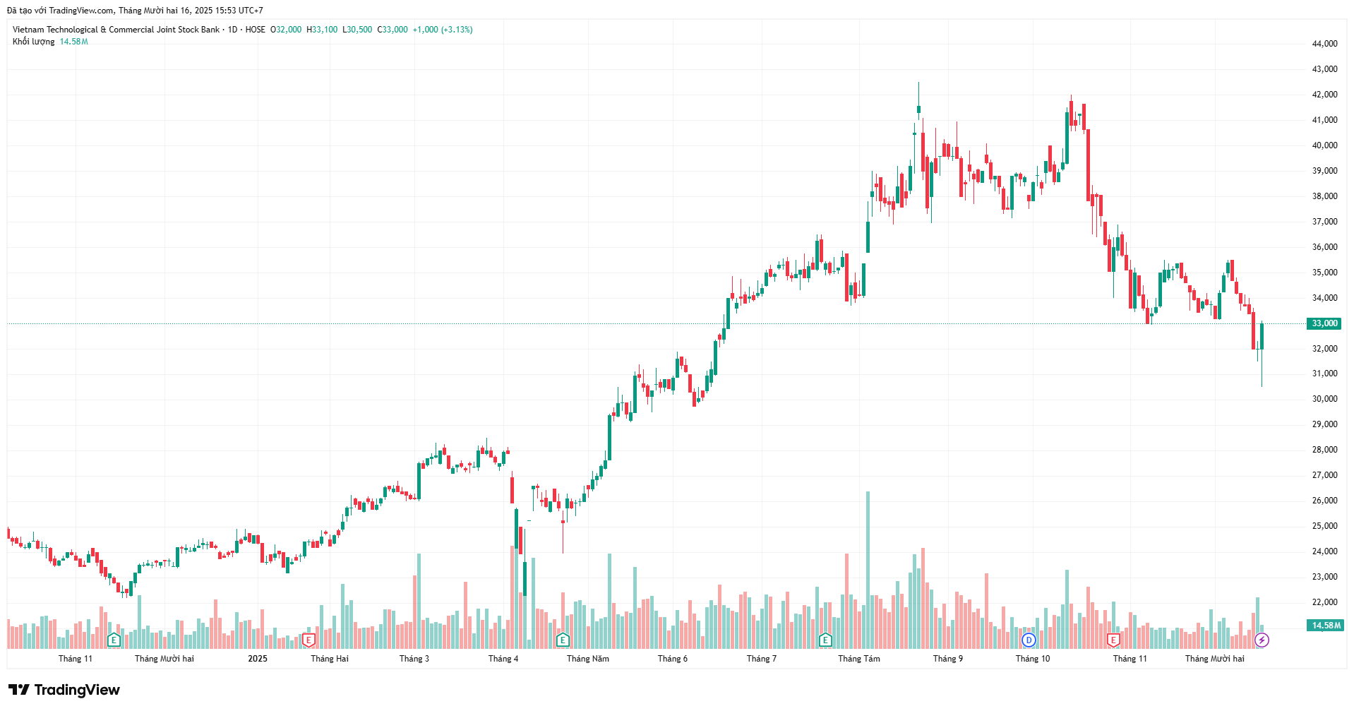 Kết thúc phiên giao dịch ngày 16/12, giá cổ phiếu TCB của Techcombank ở mức 33.000 đồng/cổ phiếu, tăng khoảng 35,52% so với đầu năm.