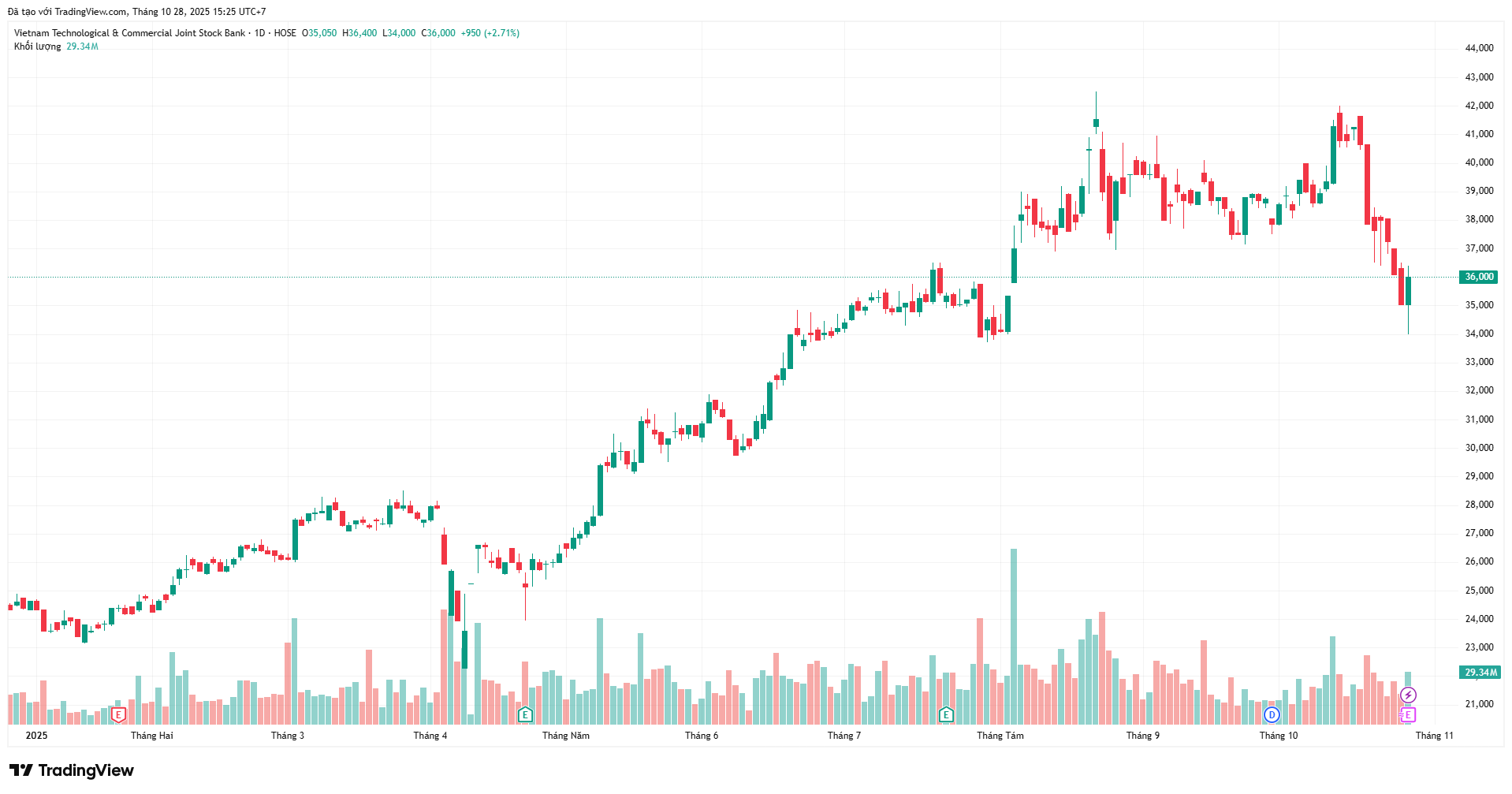 Kết thúc phiên giao dịch ngày 28/10, giá cổ phiếu TCB của Techcombank ở mức 36.000 đồng/cổ phiếu, tăng 51,77 % so với đầu năm.