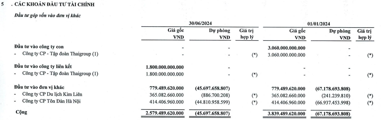 Ngoài khoản đầu tư vào Thaigroup, Thaiholdings còn đang đầu tư vào Công ty cổ phần Du lịch Kim Liên (hơn 365 tỷ đồng) và Công ty cổ phần Tôn Đản Hà Nội (hơn 414 tỷ đồng). Tuy nhiên, doanh nghiệp cũng đang trích lập dự phòng gần 46 tỷ đồng cho khoản đầu tư vào 2 doanh nghiệp này.