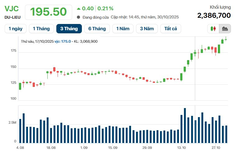 Kết thúc phiên giao dịch ngày 30/10, cổ phiếu VJC có giá 195.500 đồng/cp, tăng 51% kể từ ngày 13/10 tới nay.