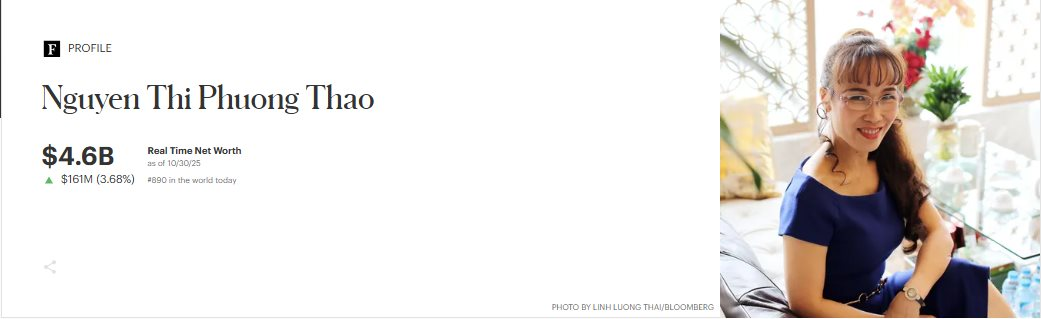 Theo bảng xếp hạng thời gian thực của Forbes, tính đến ngày 30/10, tài sản của bà Nguyễn Thị Phương Thảo đã đạt 4,6 tỷ USD, xếp thứ 890 trên thế giới.