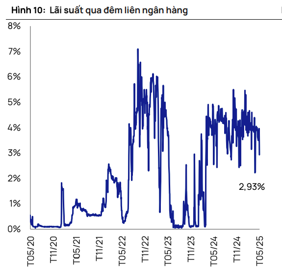 Tuy nhiên, những ngày cuối tháng 5 đã chứng kiến sự đảo chiều rõ rệt khi lãi suất qua đêm giảm mạnh, kết thúc tháng ở mức 2,93%, tương đương mức giảm 0,9 điểm % so với tháng trước, chủ yếu do thanh khoản dồi dào trong hệ thống ngân hàng.