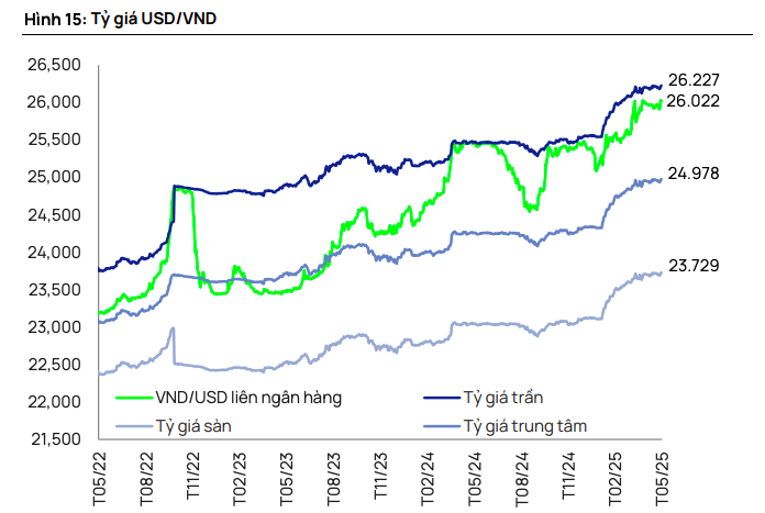 Tỷ giá USD/VND đã giảm 0,3% trong nửa đầu tháng 5 nhưng đảo chiều trong nửa cuối tháng do nhiều yếu tố nổi bật là nhu cầu USD từ KBNN; thâm hụt thương mại 2,3 tỷ USD trong nửa đầu tháng 5; lượng lớn tiền gửi của KBNN tại các NHTM khiến lãi suất liên ngân hàng giảm và tâm lý thận trọng trước đàm phán thương mại giữa Việt Nam và Mỹ.