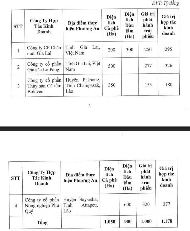 Tổng diện tích hợp tác vẫn giữ nguyên 1.050ha cà phê và 900ha dâu tằm. Nhưng phần vốn đầu tư cho dự án cà phê với Gia Súc Lơ Pang tăng từ 250 tỷ đồng lên 277 tỷ đồng, ngược lại, phần vốn đầu tư cho dự án cà phê hợp tác với Thủy sản Cá tầm Bolaven tại Lào giảm từ 180 tỷ đồng xuống 153 tỷ đồng.