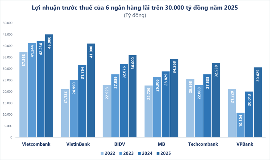 Dẫn dắt lợi nhuận của ngành vẫn là ba thành viên thuộc “Big 4” Vietcombank, VietinBank và BIDV với lợi nhuận trước thuế năm 2025 lần lượt đạt 45.000 tỷ đồng (tăng 9% so với năm 2024), 41.000 tỷ đồng (tăng 29%) và 36.000 tỷ đồng (tăng 13%).