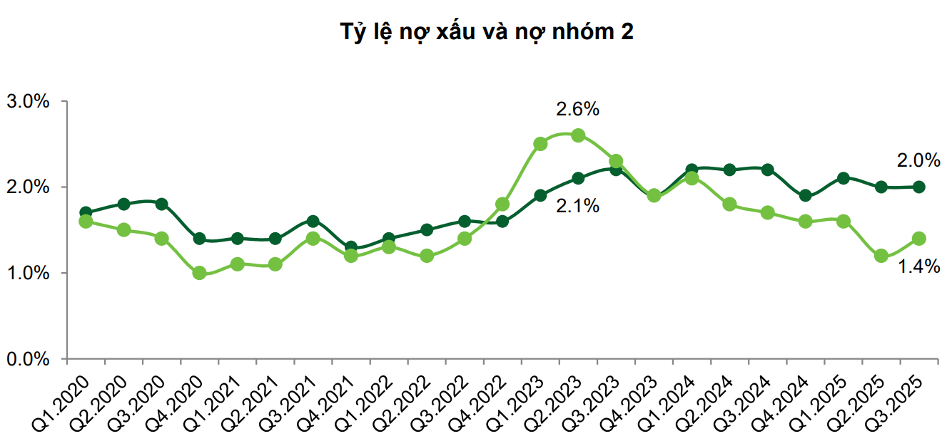 Cũng theo VNBA, rủi ro nổi bật nhất hiện nay là sự gia tăng nhanh của nợ nhóm 2, nợ quá hạn từ 90–180 ngày hoặc có dấu hiệu rủi ro mất vốn. Trong quý 3/2025, nợ nhóm 2 tăng thêm hơn 50.000 tỷ đồng, đảo chiều hoàn toàn so với xu hướng giảm của quý trước. Nguyên nhân xuất phát từ áp lực trả nợ gia tăng do mặt bằng lãi suất huy động tăng; các khoản nợ từng được tái cơ cấu đáo hạn; rủi ro nội tại từ các lĩnh vực như bất động sản, thương mại và xây dựng.