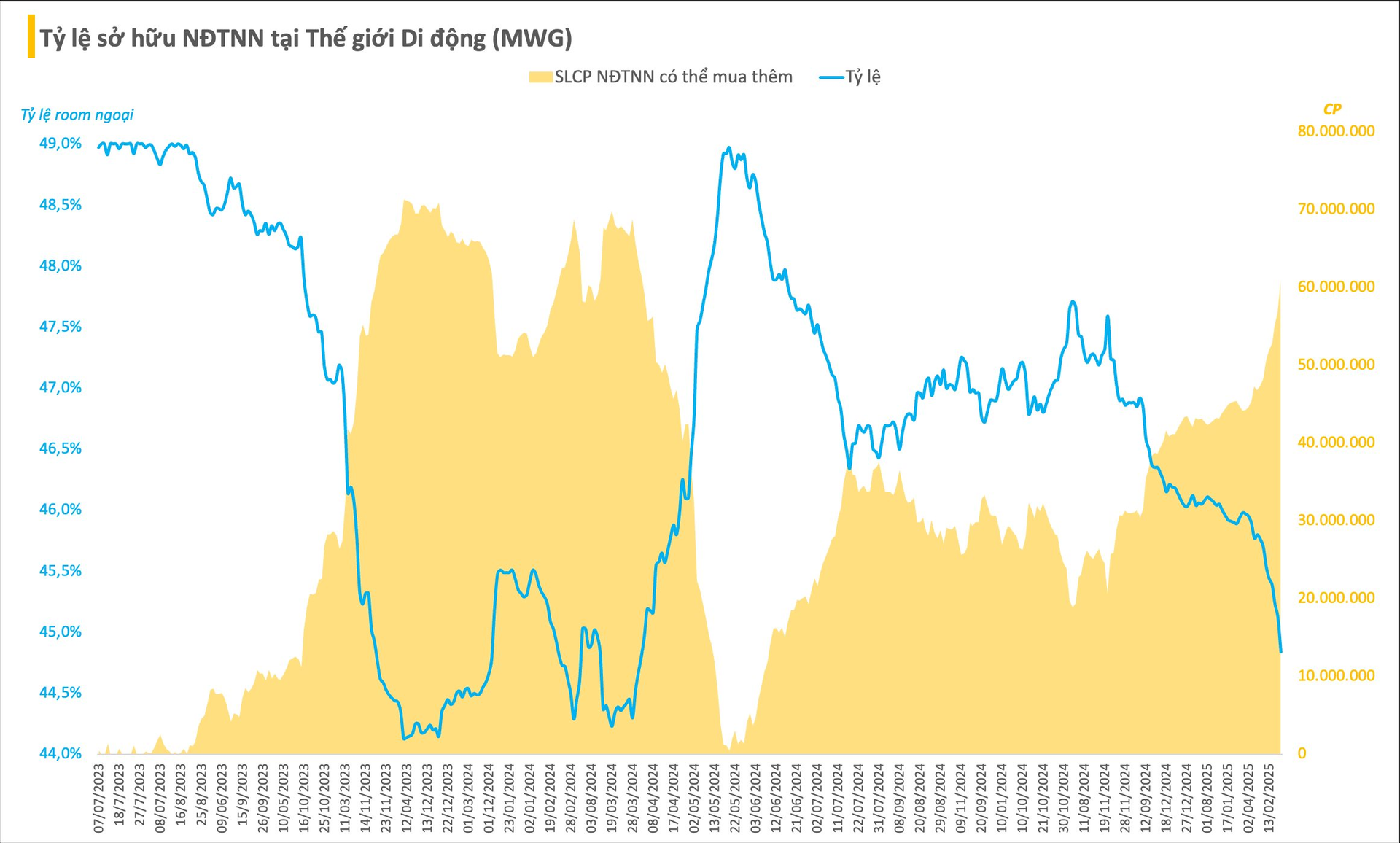 Hồi tháng 3/2024, tỷ lệ sở hữu của NĐTNN tại MWG đã từng về sát ngưỡng 44% tuy nhiên lực cầu đã nhanh chóng trở lại lấp đầy "room" ngoại tại doanh nghiệp bán lẻ này. Sau đó, tỷ lệ sở hữu của nhà đầu tư ngoại duy trì quanh ngưỡng 47-48% trước khi ồ ạt xả hàng từ cuối năm 2024 và tăng dần cường độ tới hiện tại.