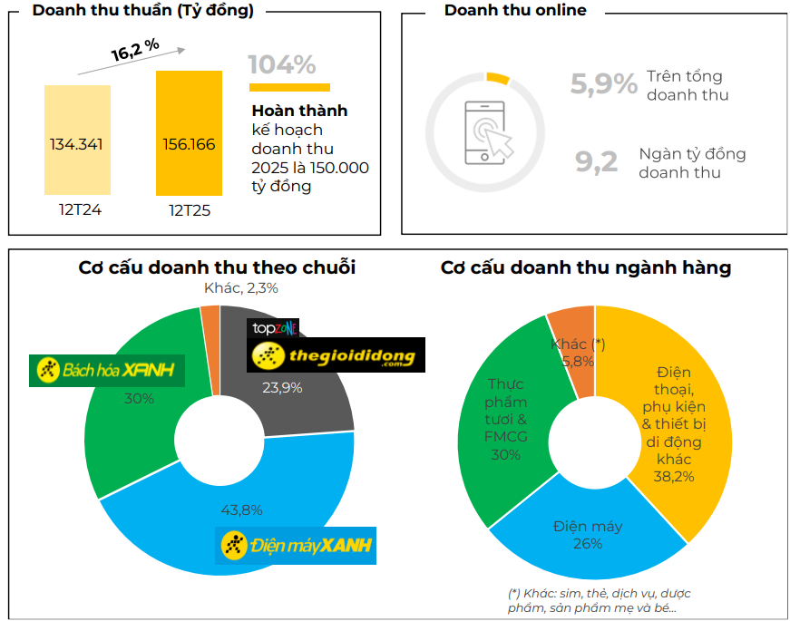 Năm qua, doanh thu của hai chuỗi Thế Giới Di Động bao gồm Topzone (TGDĐ) và Điện Máy Xanh (ĐMX) lần lượt đạt 37.300 tỷ đồng và 68.400 tỷ đồng, tương ứng mức tăng trưởng 18% so với năm 2024.