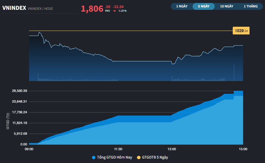Chốt phiên, chỉ số VN-Index giảm 22,54 điểm xuống 1.806,5 điểm (-1,23%). Tổng giá trị giao dịch đạt 31.811 tỷ đồng.