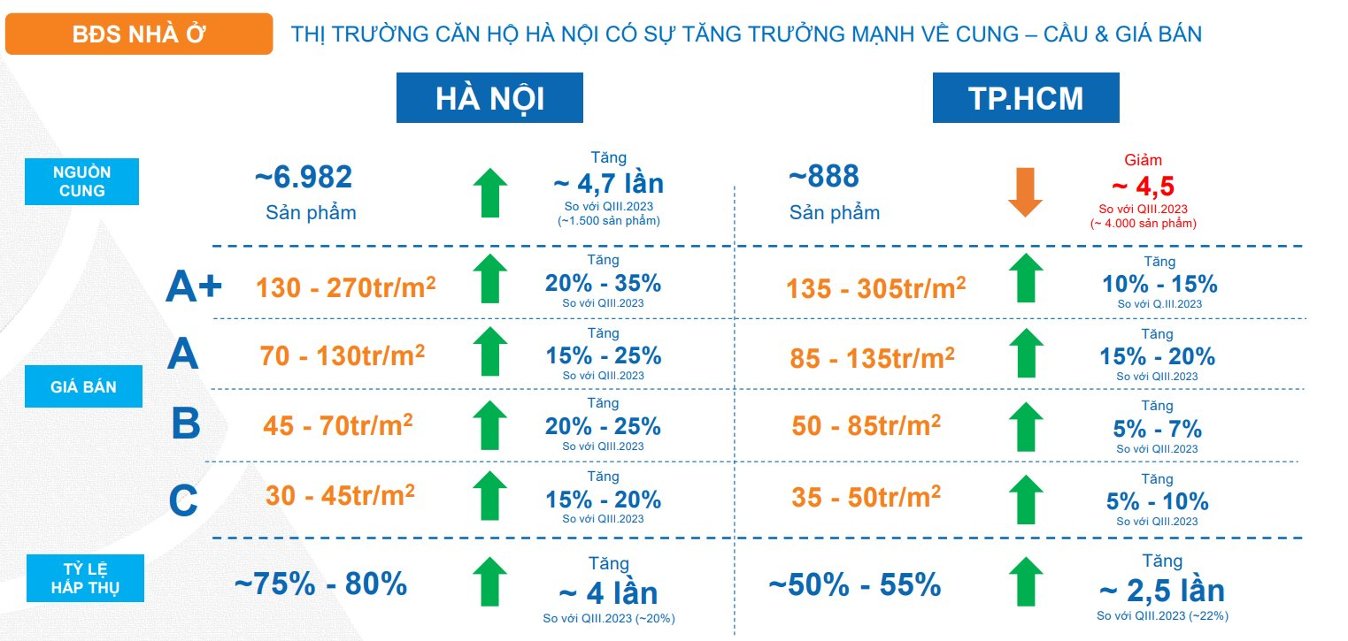 Về giá bán căn hộ tại Hà Nội có xu hướng tăng ở hầu hết các phân khúc so với cùng kỳ năm trước. Cụ thể, căn hộ hạng B và A+ ghi nhận mức tăng giá cao nhất, lên tới 20% - 35%. Theo sau là căn hộ hạng C và A ghi nhận mức giá tăng từ 15% - 25%.