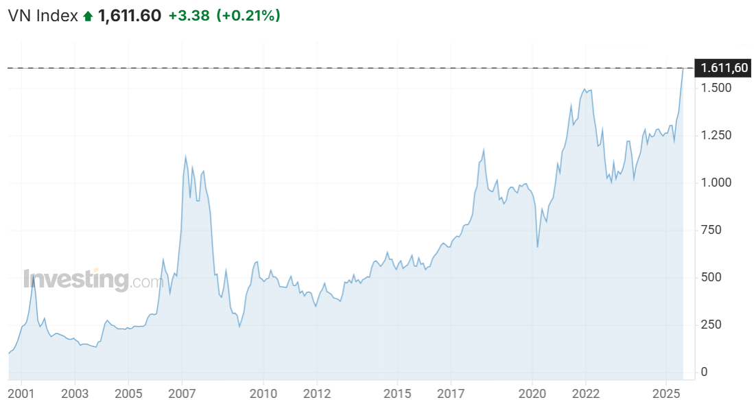 Và ngay thời điểm hiện tại, thêm một lần nữa VN-Index phá đỉnh, đang giao dịch ở vùng đỉnh lịch sử 1.600 điểm với động lực chính theo SSI Research là đến từ sự phục hồi vững chắc của tăng trưởng lợi nhuận của các doanh nghiệp trên sàn, môi trường lãi suất thuận lợi, lo ngại về rủi ro thuế quan dần được xoa dịu và đặc biệt là kỳ vọng sớm nâng hạng thị trường. Ngoài ra, đây cũng là thời điểm thị trường bắt đầu nhen nhóm một làn sóng IPO mới.