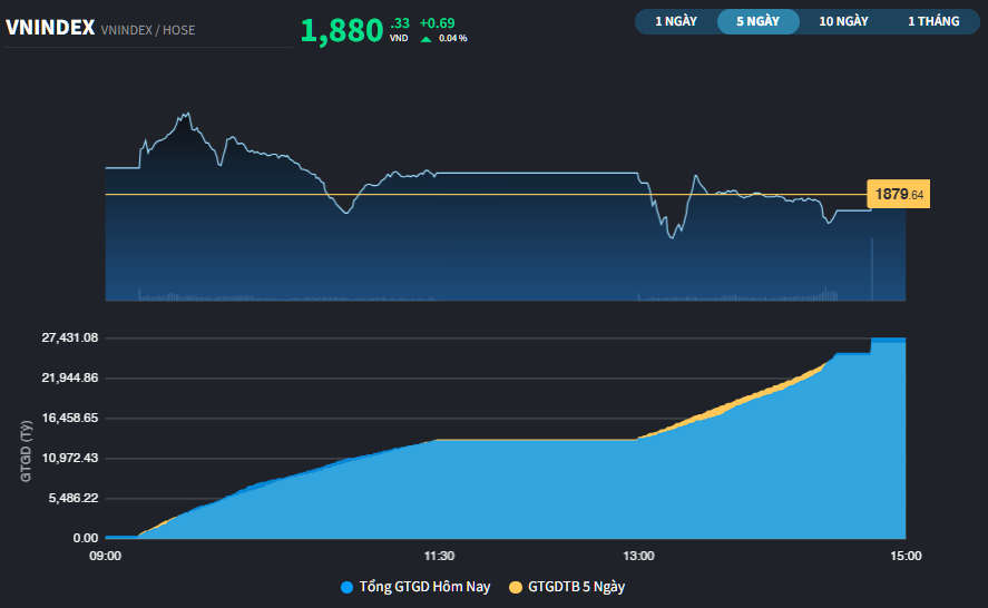 Đóng cửa, chỉ số chỉ còn tăng 0,69 điểm lên 1.880 điểm (+0,04%). Tổng giá trị giao dịch sàn đạt 29.437 tỷ đồng, tương đương 917,52 triệu đơn vị.