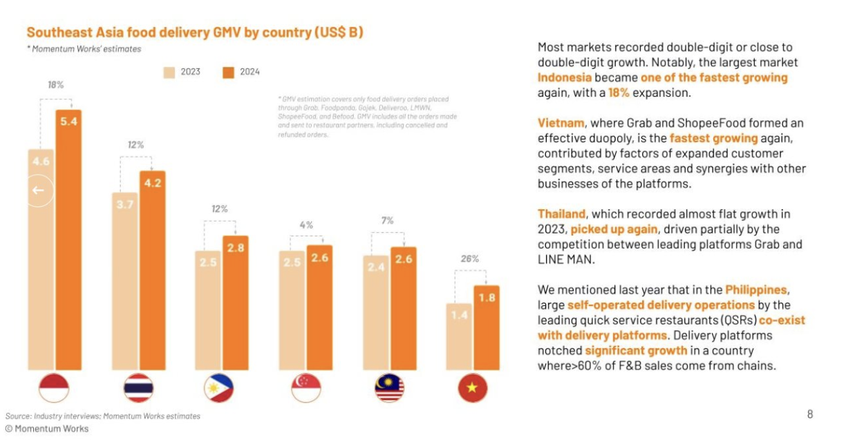 Theo Báo cáo Các nền tảng giao đồ ăn tại Đông Nam Á do Momentum Works mới phát hành, thị trường giao đồ ăn Đông Nam Á trong năm 2024 đã có bước tăng trưởng đáng chú ý, chạm mốc 19,3 tỷ USD GMV (tổng giá trị giao dịch hàng hóa), tăng 13% so với cùng kỳ năm 2023.