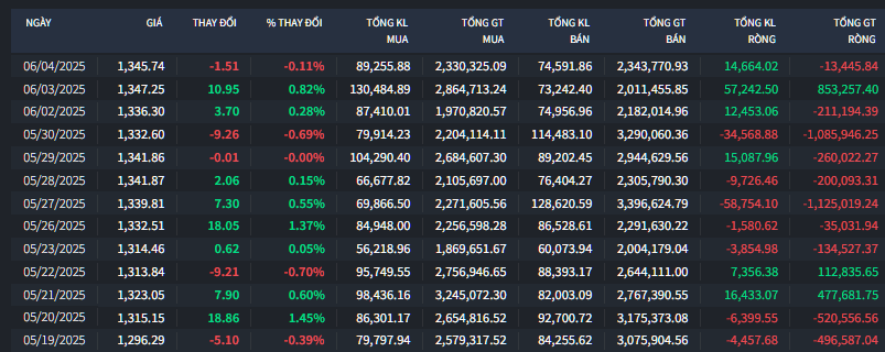 VN-Index giảm 1,51 điểm xuống 1.345,74 điểm (-0,11%). Tổng giá trị giao dịch toàn sàn đạt 23.179 tỷ đồng, tương đương 1,038 triệu đơn vị.