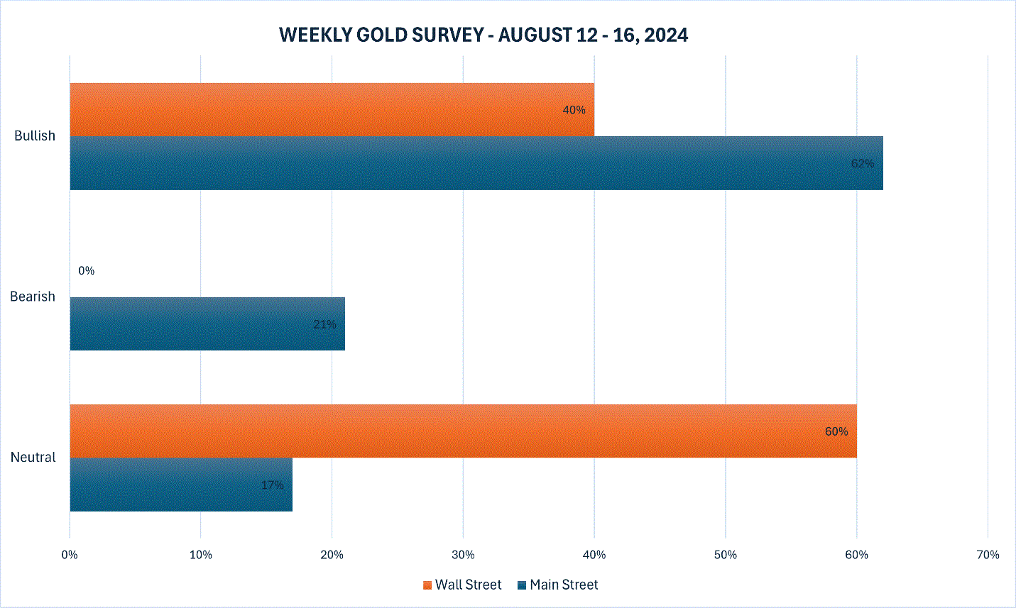 Kết quả khảo sát mới nhất cho thấy có 10 nhà phân tích trên Phố Wall đã tham gia cuộc khảo sát của Kitco News. Trong đó, 60% dự đoán giá vàng sẽ đi ngang trong tuần tới, 40% còn lại dự đoán giá sẽ tăng, không ai cho rằng giá sẽ giảm.