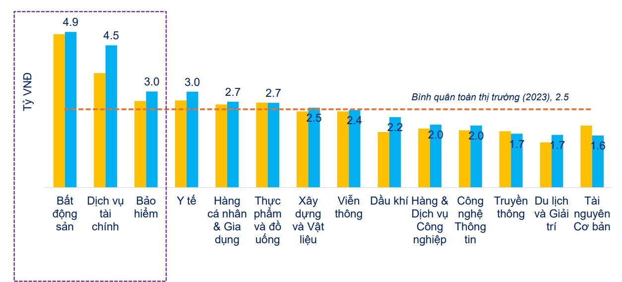Cụ thể, thu nhập bình quân năm 2023 của CEO bất động sản vẫn cao nhất, đạt 4,9 tỷ đồng dù ngành này vẫn đang trải qua giai đoạn khó khăn, hiệu quả hoạt động giảm nhiều năm liên tục. Tiếp theo là dịch vụ tài chính (chủ yếu là chứng khoán) và bảo hiểm, lần lượt đạt 4,5 tỷ đồng và 3 tỷ đồng.