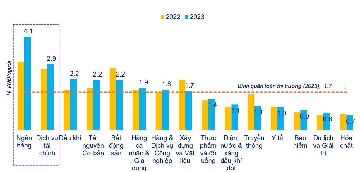 Trong khi đó, công nghệ thông tin, ngân hàng và bán lẻ là các ngành có hiệu quả hoạt động tốt hơn mặt bằng chung với tỷ suất ROE cao (>15% trong năm 2023) nhưng thu nhập bình quân của CEO lại tương đối thấp. Lý do chính là thu nhập này chưa tính đến giá trị của số cổ phiếu thưởng theo ESOP mà ban lãnh đạo nhận được.