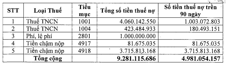 Theo thông báo từ Thuế TP.Hồ Chí Minh, căn cứ dữ liệu của người nộp thuế theo dõi trên hệ thống Quản lý thuế tại 19/9/2025, tính đến hết ngày 19/9/2025, Công ty cổ phần Phát triển Bất động sản Phát Đạt còn nợ tiền thuế, tiền phạt, tiền chậm nộp là gần 9,3 tỷ đồng. Cụ thể (theo bảng dưới).