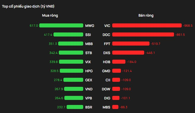 Ở chiều ngược lại, áp lực bán tâm điểm đột biến tại mã VIC với gần 970 tỷ, bên cạnh đó DGC cũng bị bán ròng hơn 860 tỷ từ đầu tháng tới nay.