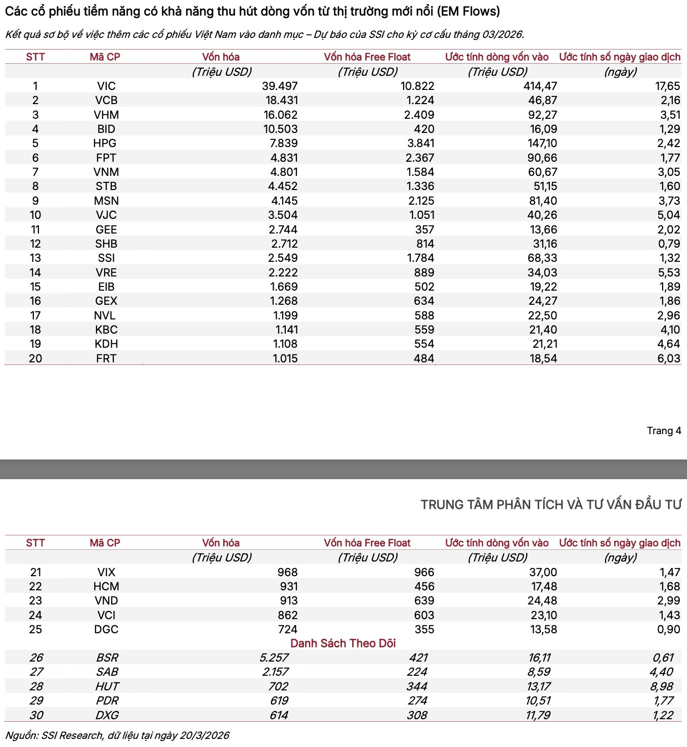 Theo ước tính của SSI Research, dòng vốn từ các quỹ theo dõi thị trường mới nổi nhiều khả năng sẽ tập trung vào nhóm cổ phiếu vốn hóa lớn, có tỷ lệ free-float cao và thanh khoản tốt. Trong đó, VIC được dự báo thu hút lượng vốn vượt trội, khoảng 414 triệu USD, bỏ xa các cổ phiếu còn lại.