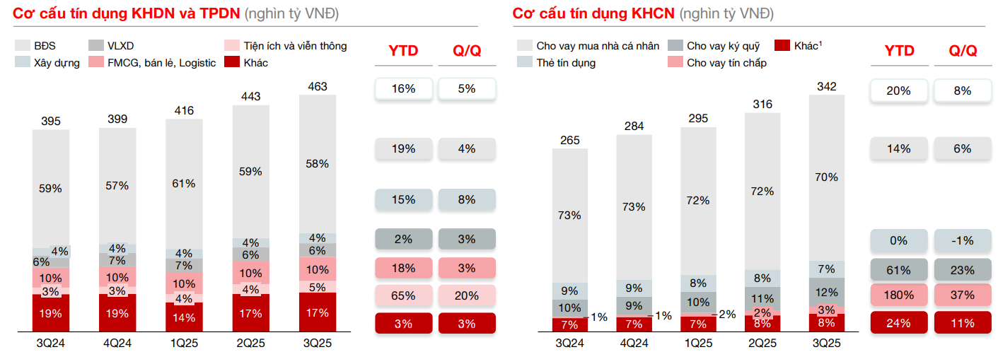 Theo thông tin Techcombank công bố hồi cuối tháng 9/2025, trong cơ cấu tín dụng khách hàng doanh nghiệp và trái phiếu doanh nghiệp, tỷ trọng cho vay bất động sản chiếm tới 58% (tăng 4% so với quý trước và tăng 19% từ đầu năm đến nay). Tỷ trọng này ở mảng khách hàng cá nhân, chủ yếu là cho vay mua nhà, thậm chí còn lên tới 70% (tăng 6% so với quý trước và tăng 14% kể từ đầu năm).