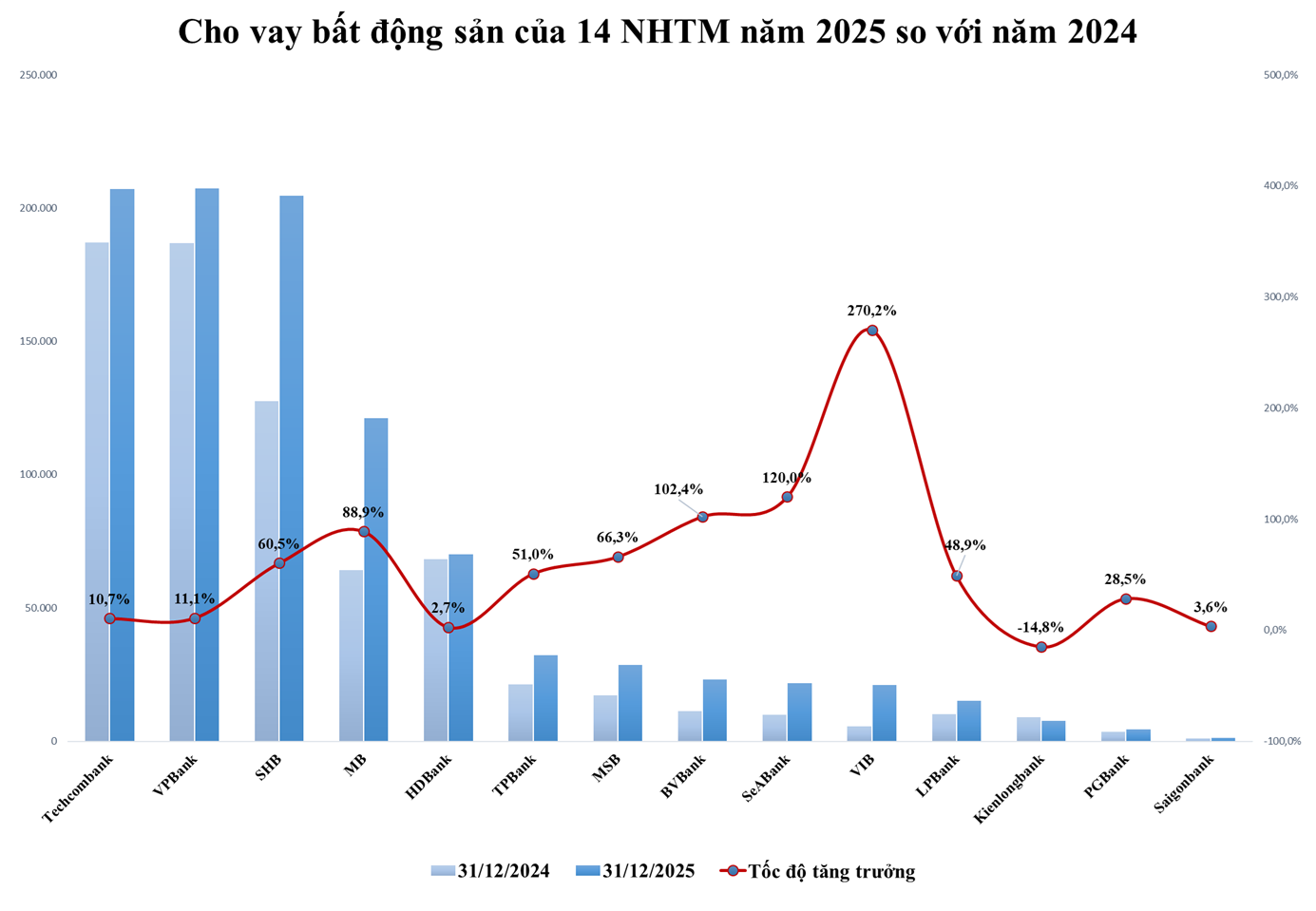 Theo đó, tổng dư nợ cho vay kinh doanh bất động sản của 14 ngân hàng tính đến cuối năm 2025 đạt xấp xỉ 966.000 tỷ đồng, tăng trên 242.600 tỷ đồng, tương đương 33,5% so với cuối năm 2024, và cao gấp rưỡi mức tăng trưởng tín dụng chung của toàn nền kinh tế (hơn 19%).