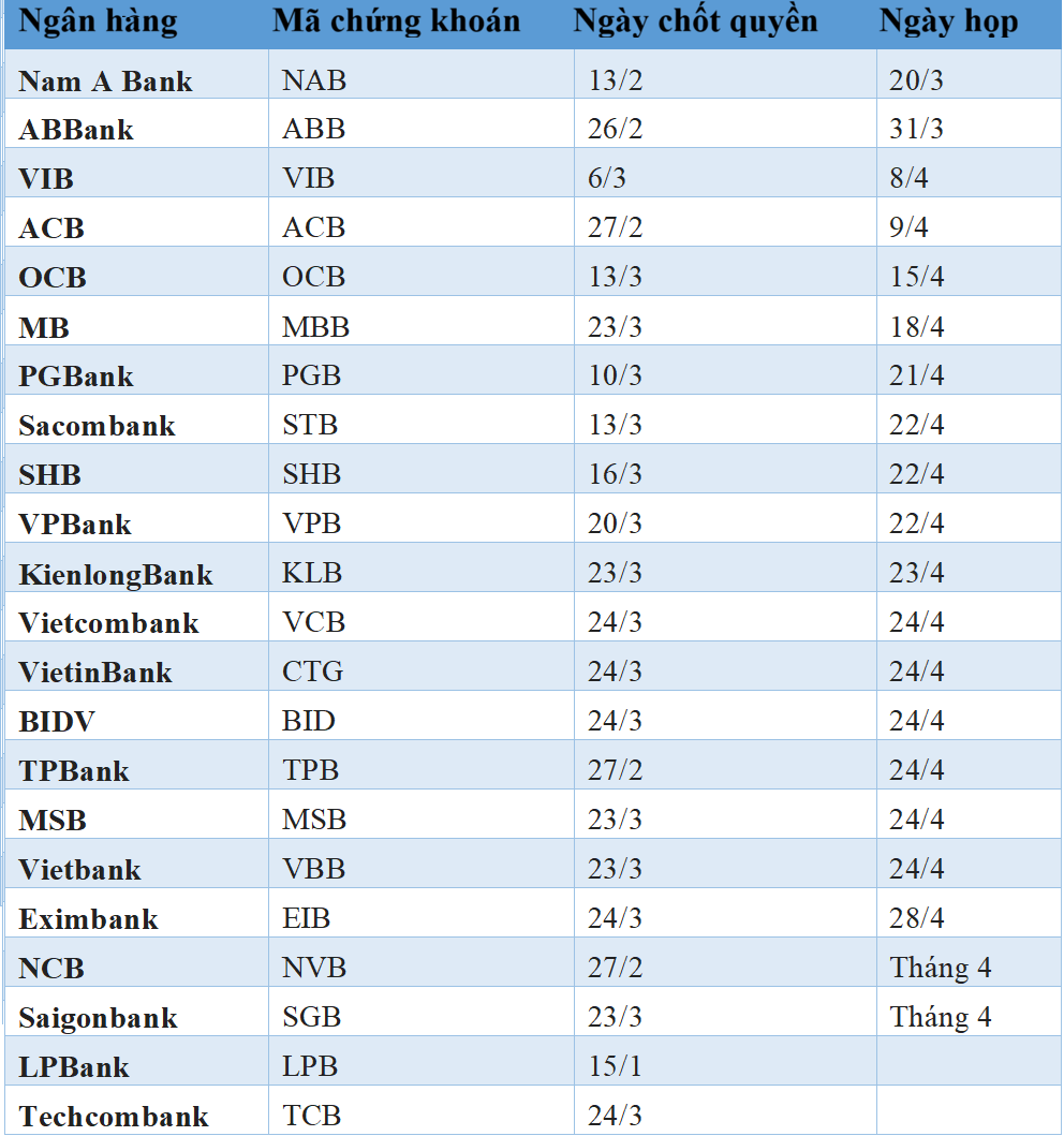 Hiện nhiều ngân hàng đã công bố ngày chốt danh sách cổ đông và ngày dự kiến tổ chức họp ĐHĐCĐ, phần lớn diễn ra từ giữa đến cuối tháng 4/2026.