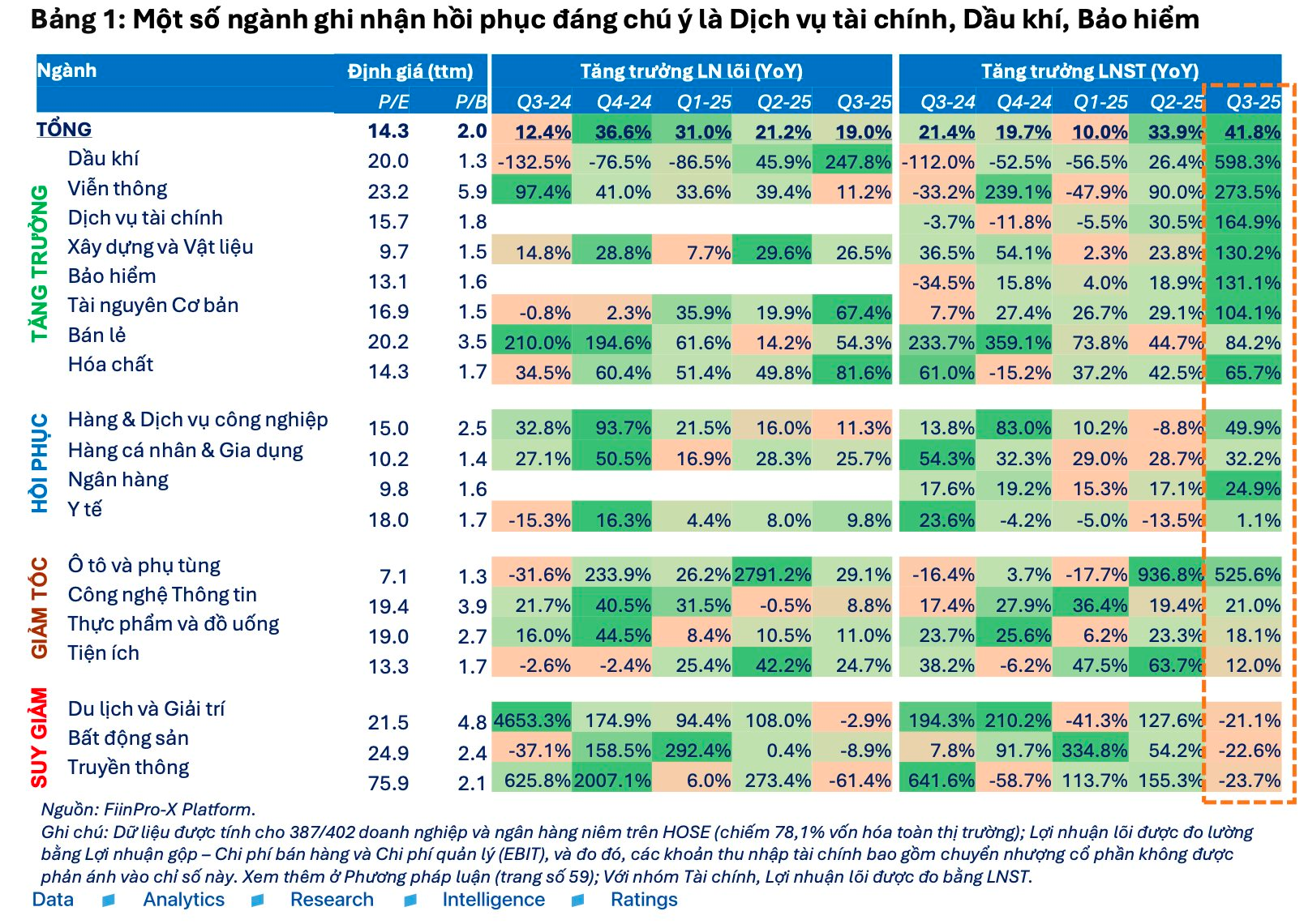 Ngành Bảo hiểm cũng ghi nhận tăng trưởng mạnh, với BVH, PVI, MIG nổi bật nhờ nền so sánh thấp khi cùng kỳ chịu ảnh hưởng từ bão Yagi. Tuy nhiên, rủi ro bồi thường từ các cơn bão sau tháng 9 vẫn chưa được phản ánh trong kết quả kinh doanh quý 3, nên tăng trưởng lợi nhuận có thể chững lại trong quý 4/2025.