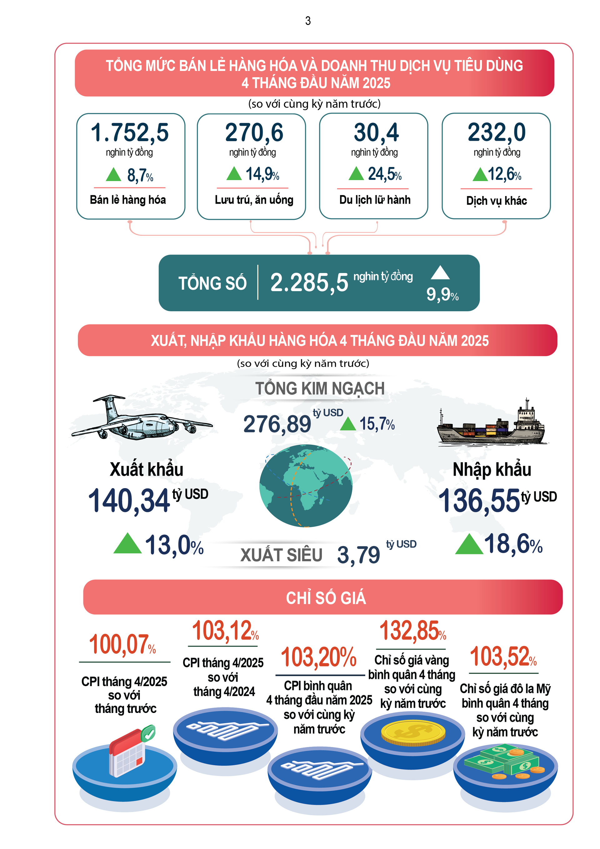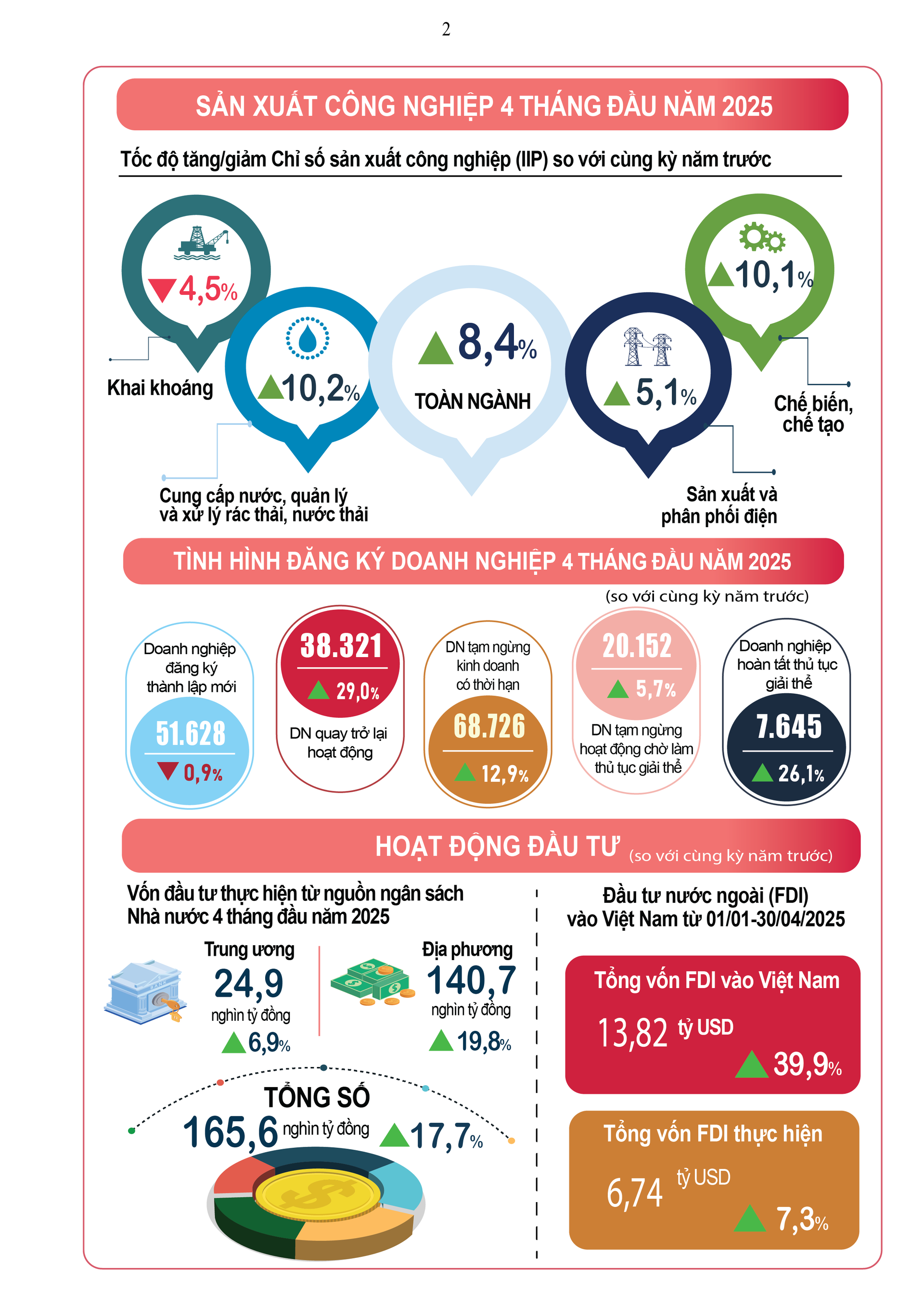 Số liệu về tình hình kinh tế - xã hội 4 tháng đầu năm 2025 của Cục Thống kê cho thấy nhiều điểm sáng như: tổng vốn đầu tư nước ngoài vào Việt Nam đạt 13,82 tỷ USD, tăng 39,9% so với cùng kỳ năm trước; tổng kim ngạch xuất, nhập khẩu hàng hóa đạt 276,89 tỷ USD, tăng 15,7% so với năm trước; khách quốc tế đến Việt Nam đạt gần 7.673,4 nghìn lượt người, tăng 23,8% so với năm trước...