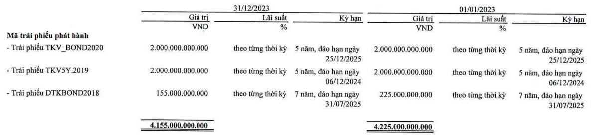Trong 33.900 tỷ đồng nợ vay, dư nợ trái phiếu tại thời điểm 31/12/2023 của TKV là 4.155 tỷ đồng. Trong đó, hai mã TKV5Y.2019 (đáo hạn vào ngày 6/12/2024) và mã TKV_BOND2020 (đáo hạn vào ngày 25/12/2025) đều còn nguyên dư nợ là 2.000 tỷ đồng mỗi lô.