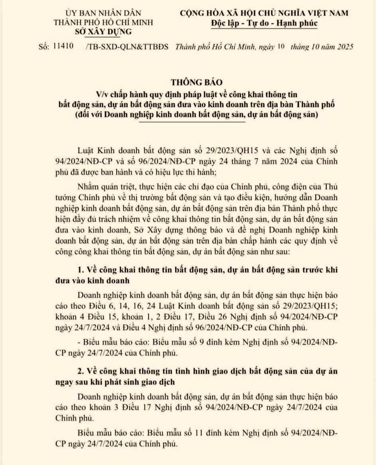 Ngày 10/10, Sở Xây dựng TP HCM vừa ban hành thông báo về việc chấp hành quy định pháp luật về công khai thông tin bất động sản, dự án bất động sản đưa vào kinh doanh trên địa bàn Thành phố (đối với doanh nghiệp kinh doanh BĐS, dự án BĐS).