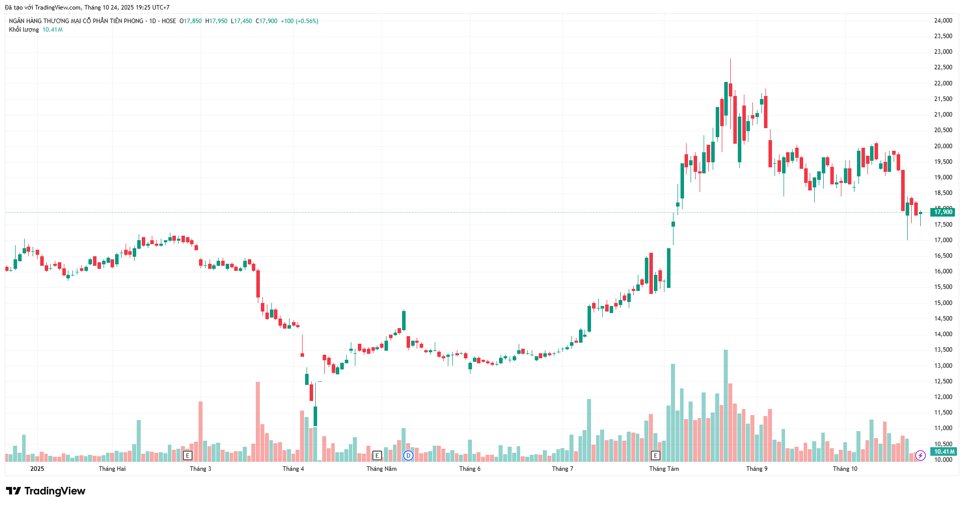 Kết thúc phiên giao dịch ngày 24/10, giá cổ phiếu của TPBank ở mức 17.900 đồng/cổ phiếu, tăng gần 8,16 % so với đầu năm.