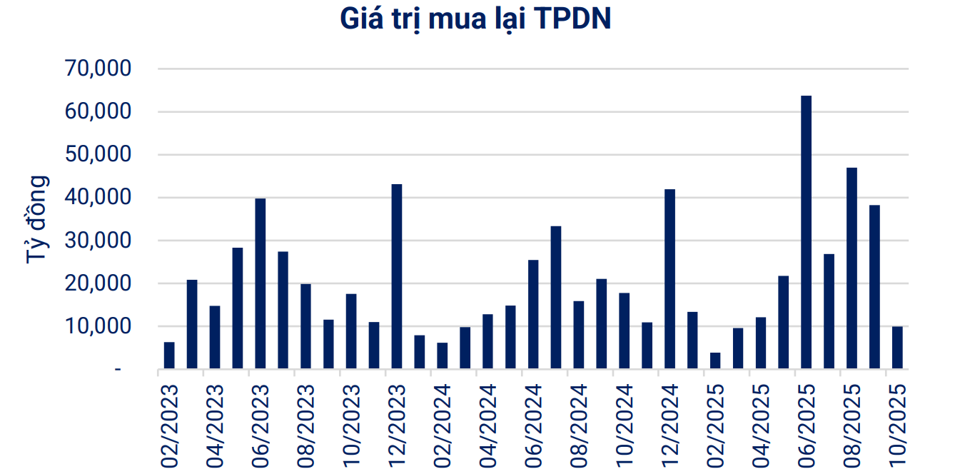 Ở chiều mua lại, trong tháng 10, các doanh nghiệp đã mua lại 9.948 tỷ đồng trái phiếu trước hạn, giảm 44% so với cùng kỳ năm 2024 và giảm 49% so với tháng trước.