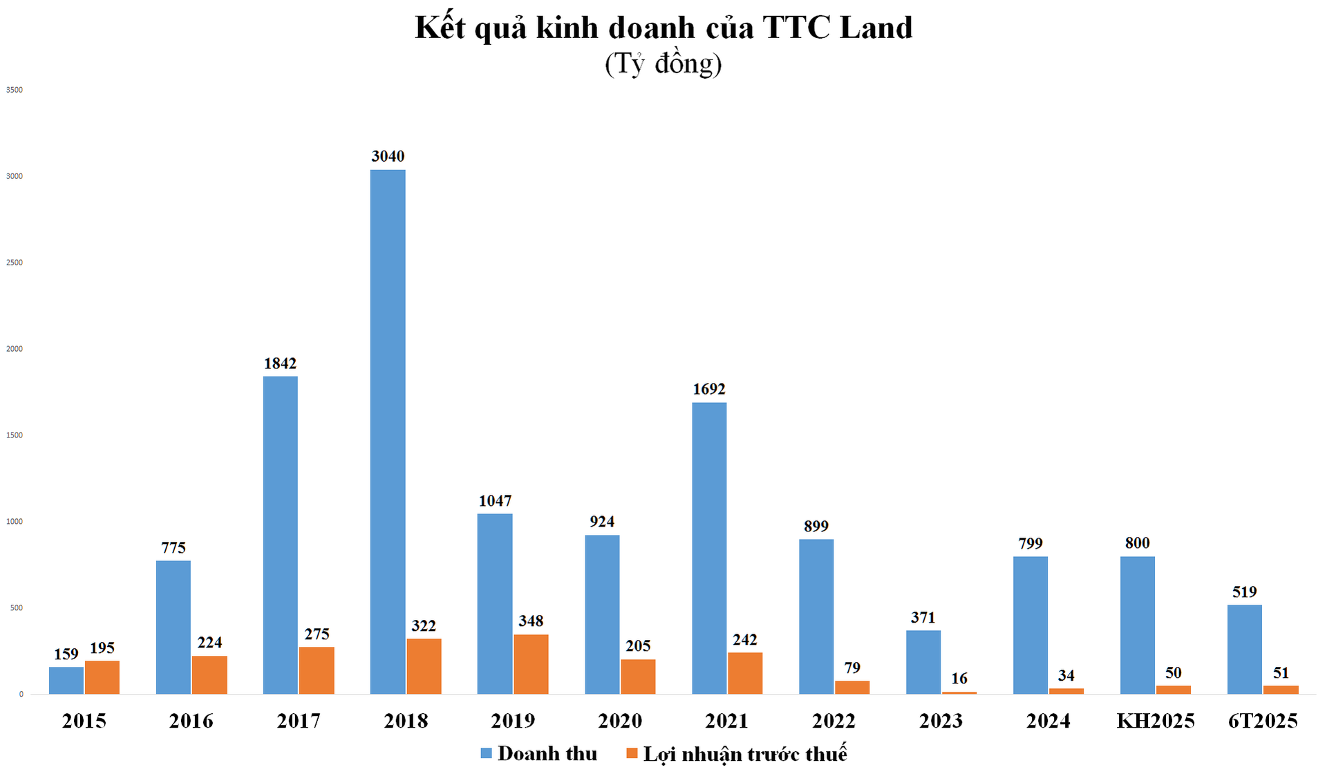Kết thúc nửa đầu năm, TTC Land thu về gần 519 tỷ đồng doanh thu, tăng 359% so với nửa đầu năm 2024. Lợi nhuận trước thuế và sau thuế của công ty lần lượt đạt 51 tỷ đồng (tăng 218% so với cùng kỳ) và 32 tỷ đồng (tăng 48,7 lần). Với kết quả này, công ty đã thực hiện được 65% kế hoạch doanh thu và hoàn thành vượt kế hoạch lợi nhuận cả năm.