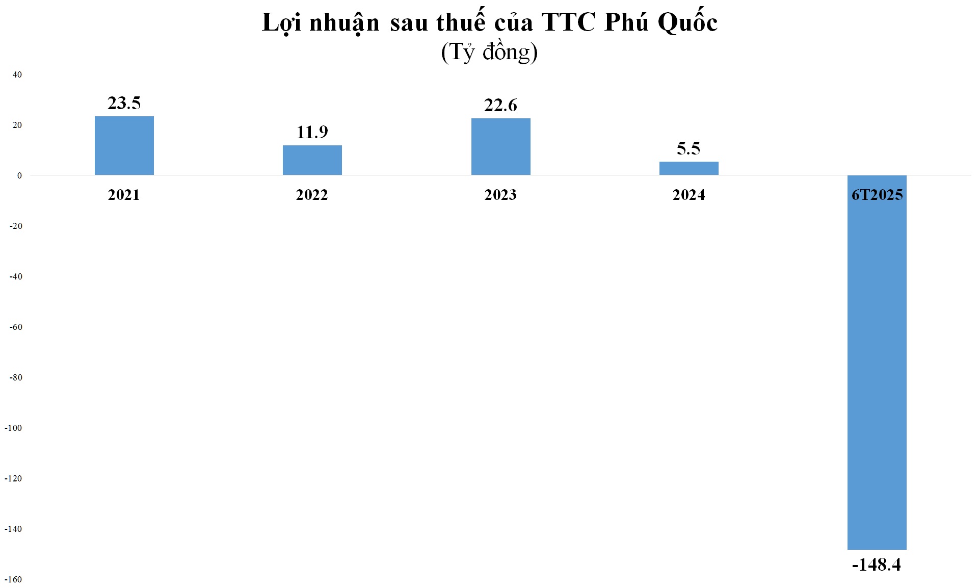 Theo đó, nửa đầu năm 2025, TTC Phú Quốc lỗ sau thuế hơn 148 tỷ đồng, trong khi cùng kỳ năm trước vẫn lãi sau thuế gần 21 tỷ đồng. Khoản lỗ đậm trong nửa đầu năm nay đã “thổi bay” toàn bộ lợi nhuận sau thuế tích lũy của TTC Phú Quốc, thậm chí khiến doanh nghiệp lỗ lũy kế hơn 49 tỷ đồng, tại thời điểm ngày 30/6/2025.