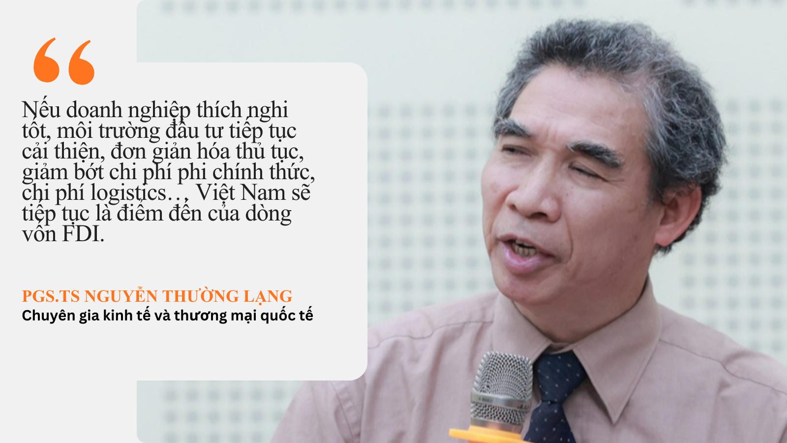 PGS.TS Nguyễn Thường Lạng, chuyên gia kinh tế và thương mại quốc tế, giảng viên cao cấp Viện Thương mại và Kinh tế quốc tế (Đại học Kinh tế Quốc dân), nhận định: "Với mức thuế tương đương nhiều nước ASEAN, lợi thế cạnh tranh của Việt Nam vẫn được giữ vững. Nếu doanh nghiệp thích nghi tốt, môi trường đầu tư tiếp tục cải thiện, đơn giản hóa thủ tục, giảm bớt chi phí phi chính thức, chi phí logistics… Việt Nam sẽ tiếp tục là điểm đến của dòng vốn FDI”.