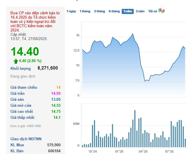 Trên thị trường, cổ phiếu ORS diễn biến tương đối khởi sắc, thị giá trong phiên 27/8 đạt 14.400 đồng/cp, tăng gần gấp đôi kể từ vùng đáy đầu tháng 4/2025.