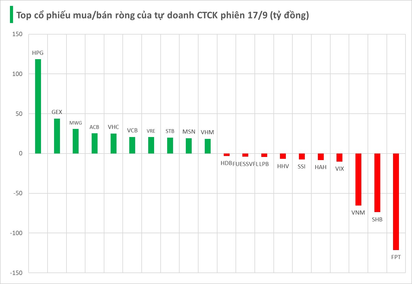 Cụ thể, HPG được mua ròng áp đảo với giá trị 118 tỷ đồng, bỏ xa phần còn lại. Theo sau là GEX (44 tỷ), MWG (31 tỷ), ACB (25 tỷ), VHC (25 tỷ), VCB (21 tỷ), VRE (21 tỷ), STB (20 tỷ), MSN (19 tỷ) và VHM (18 tỷ đồng) đều được tự doanh CTCK mua mạnh.