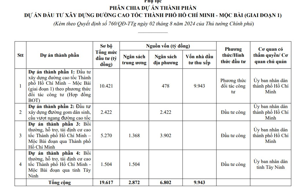 Trước đó, theo Tờ trình số 2447/TTr-UBND ngày 17/7/2024 của Ủy ban nhân dân Tp.HCM gửi Thủ tướng Chính phủ, dự án cao tốc TP.HCM - Mộc Bài giai đoạn 1 dài 51 km được đề xuất đầu tư theo phương thức đối tác công tư (PPP), hợp đồng BOT với tổng mức đầu tư 19.617 tỷ đồng; trong đó phần vốn nhà nước tham gia chiếm 49,31%, được kiến nghị chia thành 4 dự án thành phần và giao cho Ủy ban nhân dân Tp.HCM và Tây Ninh làm cơ quan chủ quản.