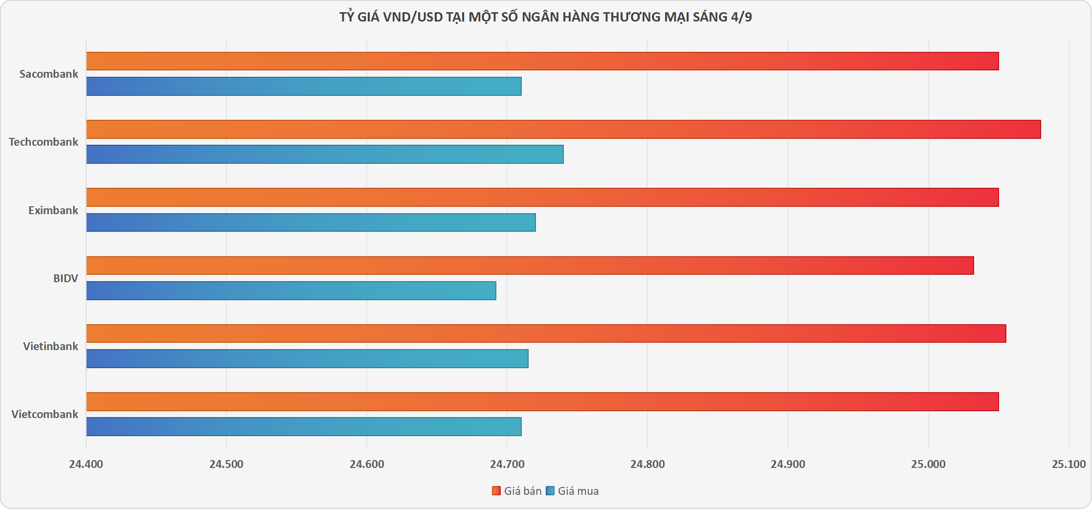 Trong khi Sacombank đang niêm yết USD ở mức 24.710 - 25.050 VND/USD, giảm 20 đồng ở cả hai chiều mua - bán so với phiên trước đó.