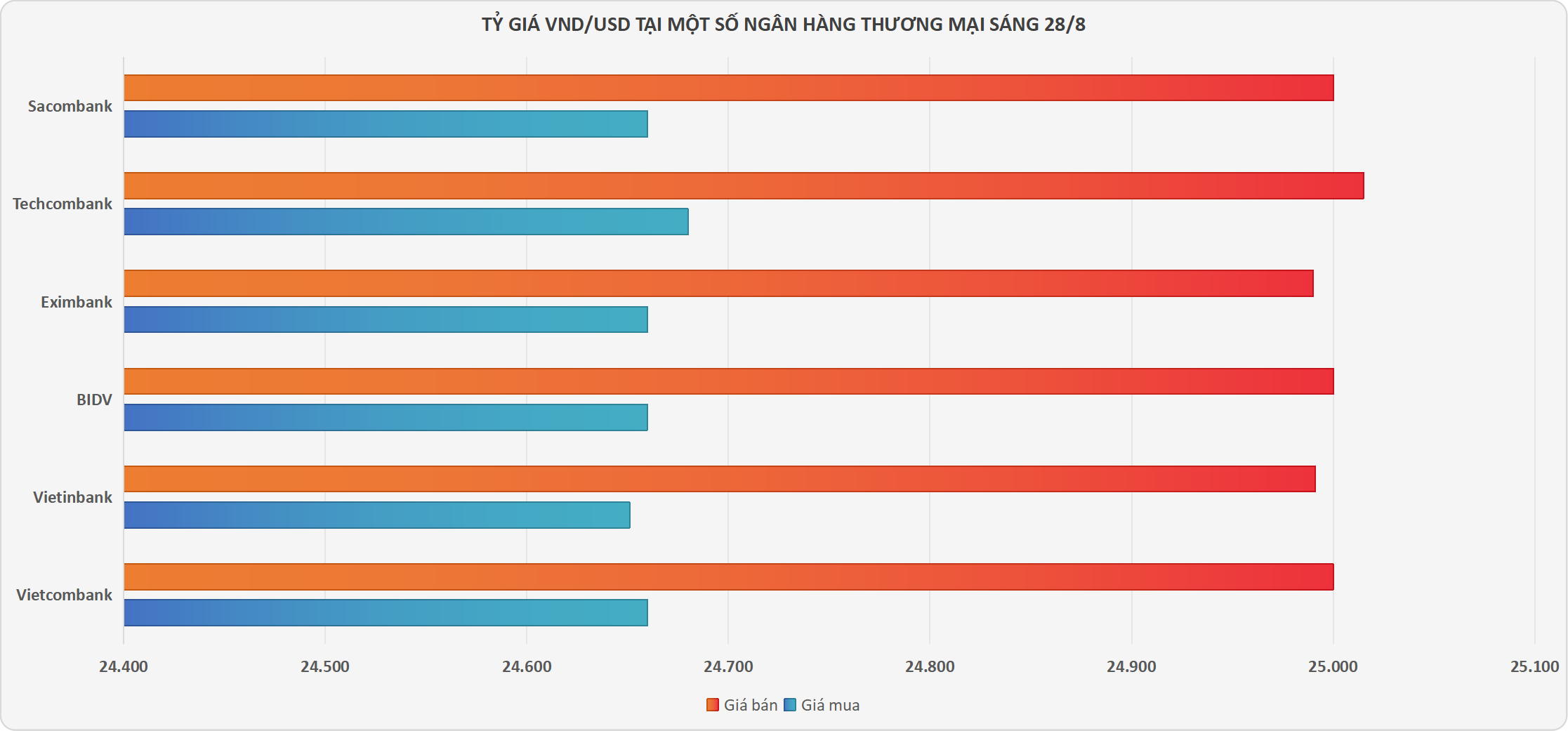 Trên thị trường liên ngân hàng, tỷ giá chốt phiên với mức 24.828 VND/USD, giảm tiếp 45 đồng so với phiên 26/8. Tỷ giá trên thị trường tự do giảm 50 đồng ở chiều mua vào trong khi không thay đổi ở chiều bán ra, giao dịch tại 25.150 VND/USD và 25.300 VND/USD.