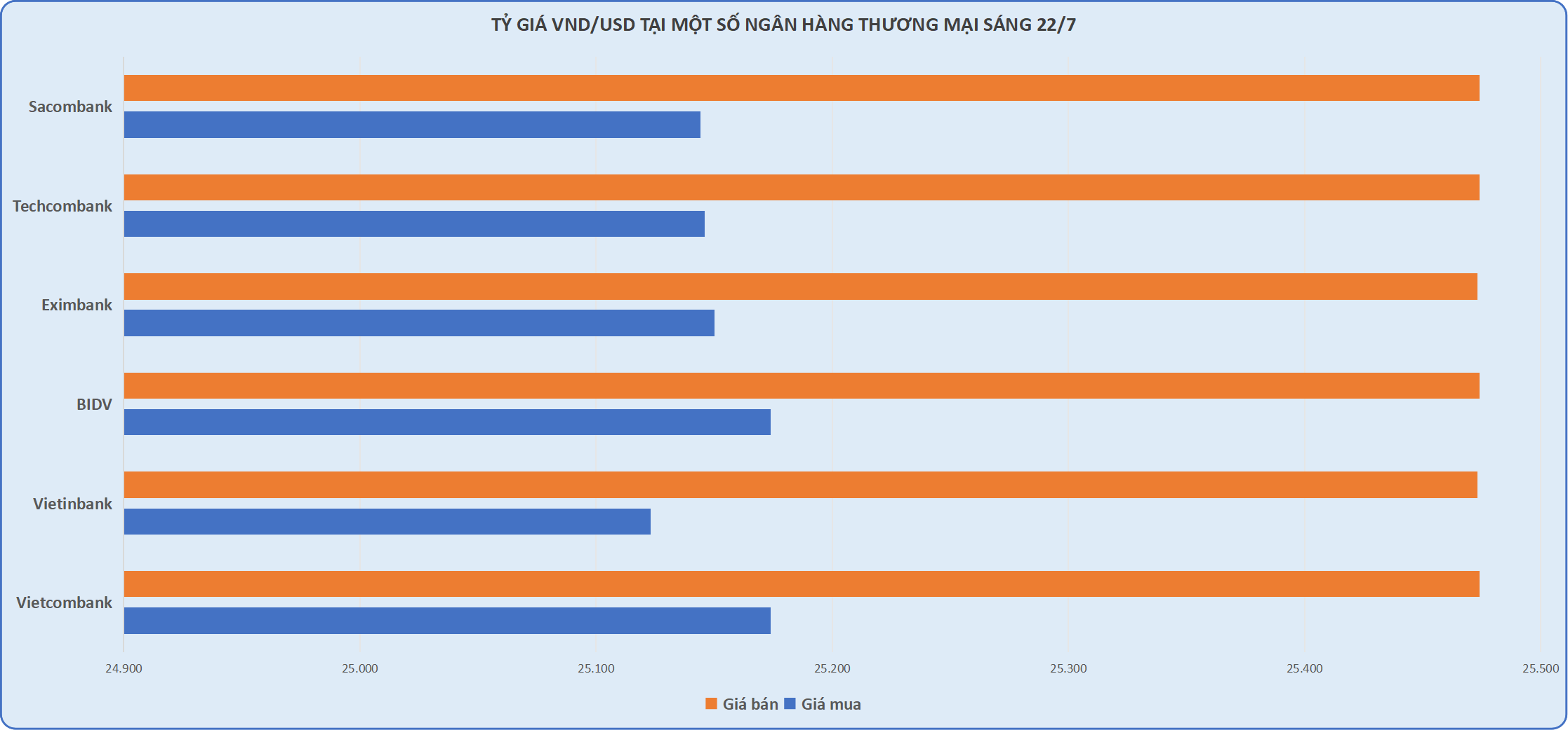 Techcombank đang niêm yết USD ở mức 25.146 - 25.474 VND/USD, giảm 7 đồng ở chiều mua và tăng 16 đồng ở chiều bán. Trong khi đó Sacombank đang niêm yết USD ở mức 25.144 - 25.474 VND/USD, giảm 4 đồng chiều mua và tăng 19 đồng ở chiều bán so với phiên khảo sát liền trước.