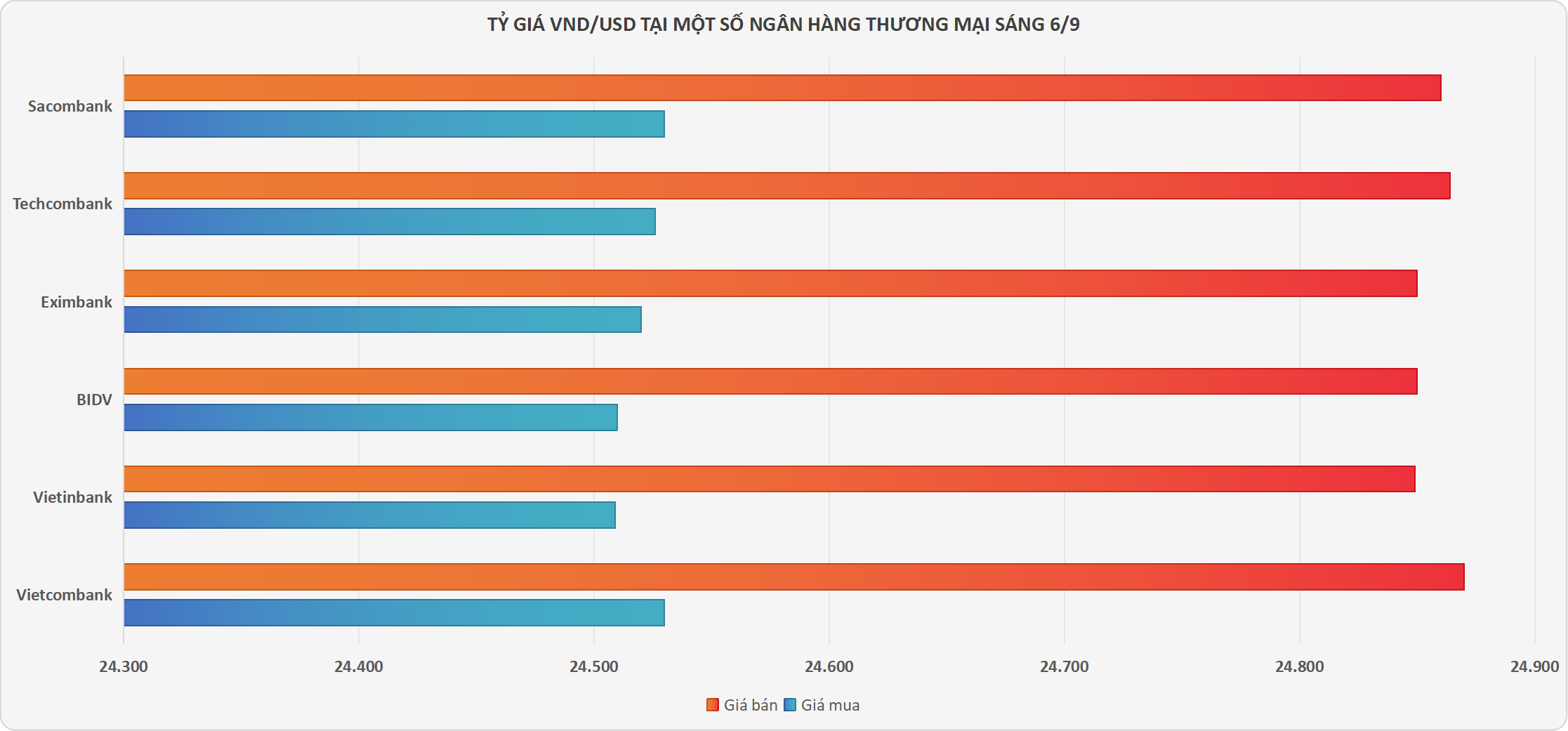 Trong khi Sacombank đang niêm yết USD ở mức 24.530 - 24.860 VND/USD, giảm 160 đồng ở hai chiều mua - bán so với phiên trước đó.