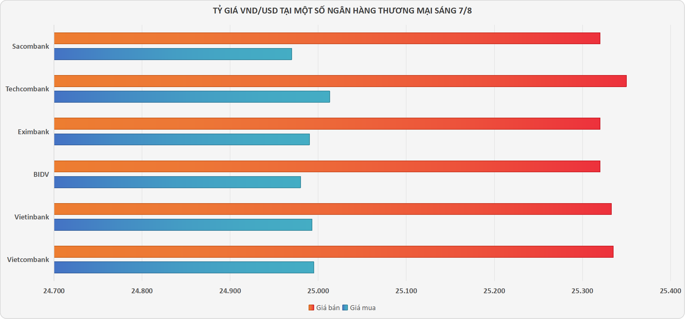 Techcombank đang niêm yết USD ở mức 25.013 - 25.350 VND/USD, tăng 75 đồng ở chiều mau và 77 đồng ở chiều bán so với phiên liền trước. Trong khi Sacombank đang niêm yết USD ở mức 24.970 - 25.320 VND/USD, tăng 40 đồng chiều mua và 50 đồng ở chiều bán so với phiên khảo sát liền trước.