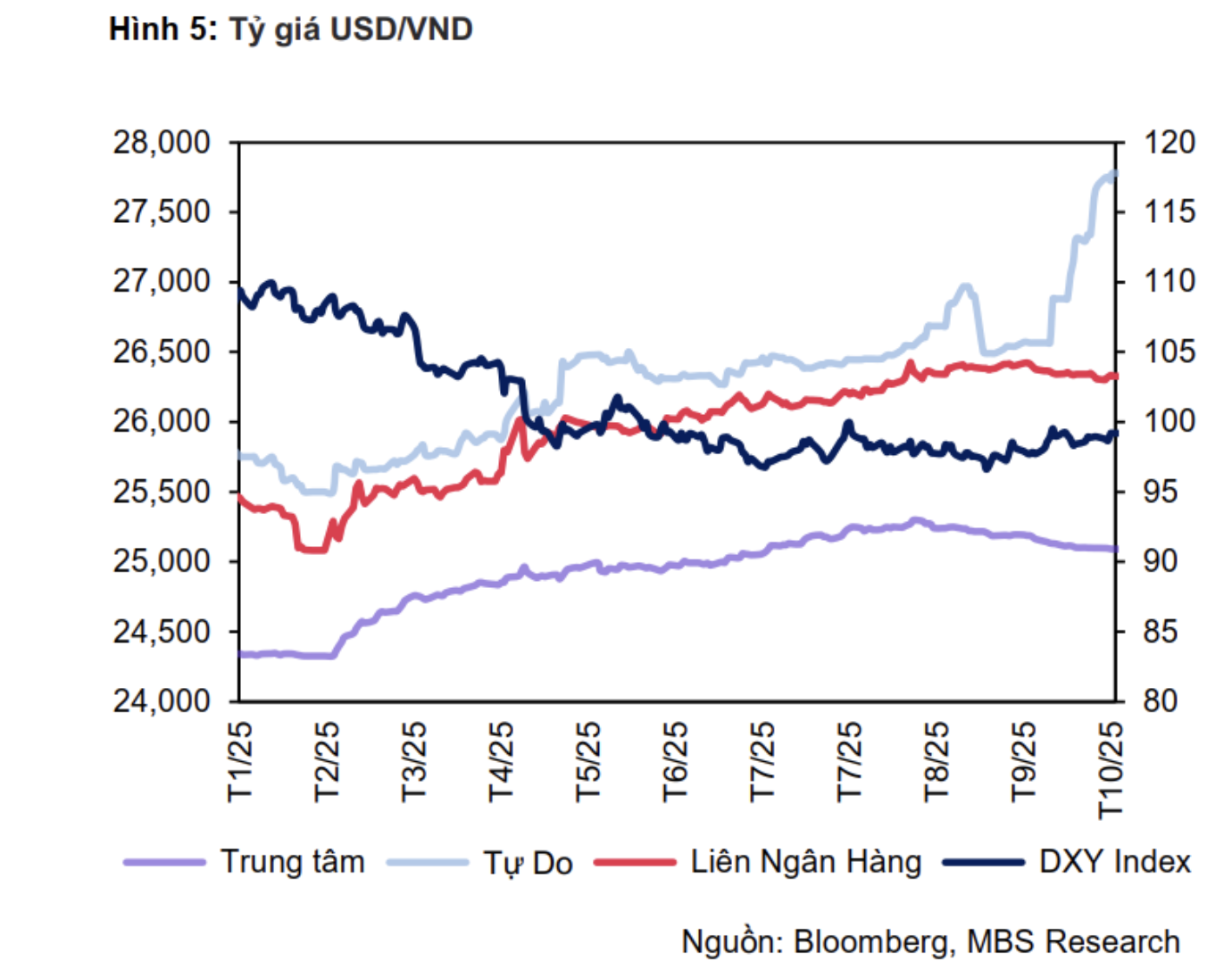 KBSV dự báo, trong quý IV/2025, tỷ giá USD/VND sẽ không tăng vượt quá 4% so với cuối năm 2024. Trong ngắn hạn, tỷ giá có thể xuất hiện những giai đoạn căng thẳng cục bộ do nhu cầu ngoại tệ cao đến từ hoạt động rút vốn của nhà đầu tư gián tiếp FII, các doanh nghiệp FDI chuyển lợi nhuận về nước, nhu cầu mua USD của kho bạc cũng như của các doanh nghiệp xuất khẩu…