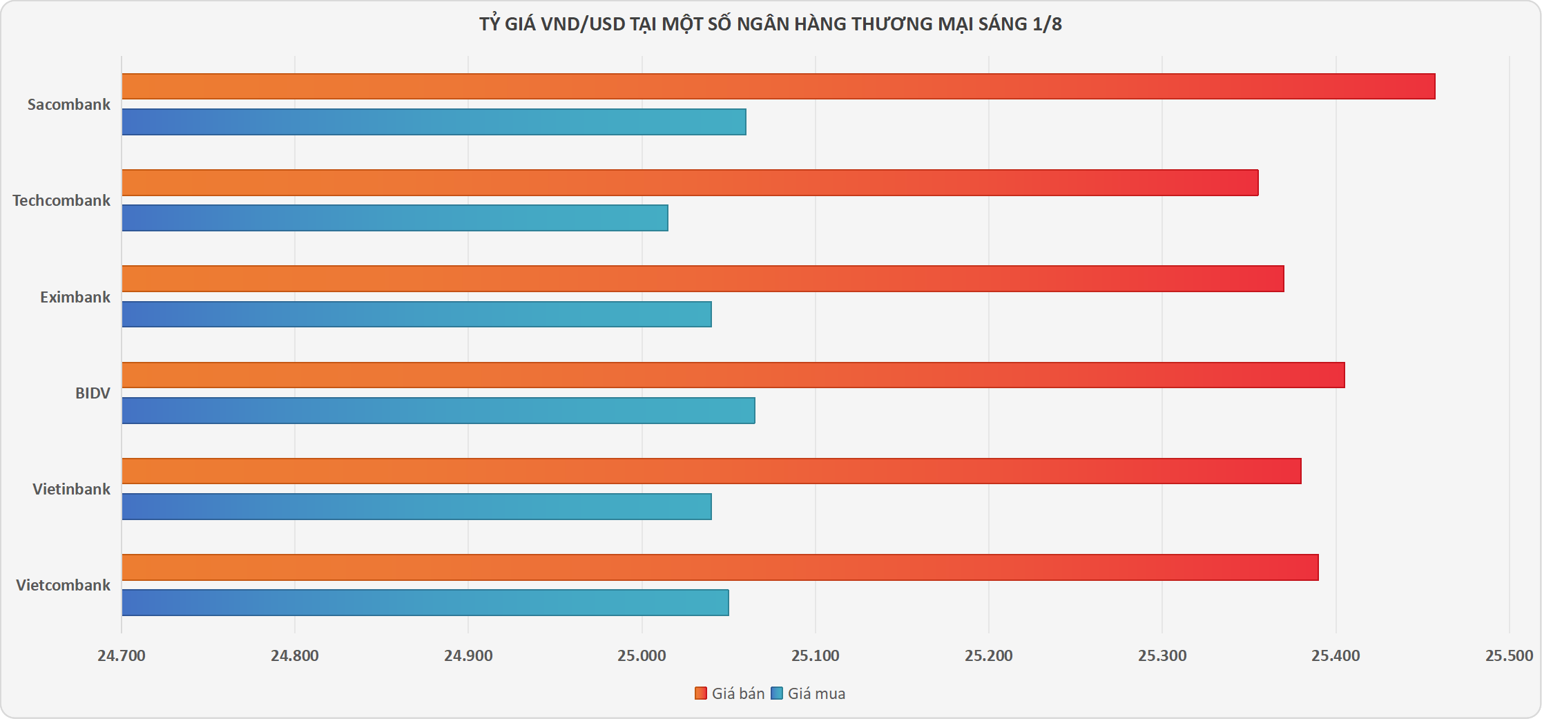 Sáng nay (1/8), tỷ giá trung tâm đang được niêm yết ở mức 24.245 VND/USD, giảm 10 đồng so với phiên liền trước.