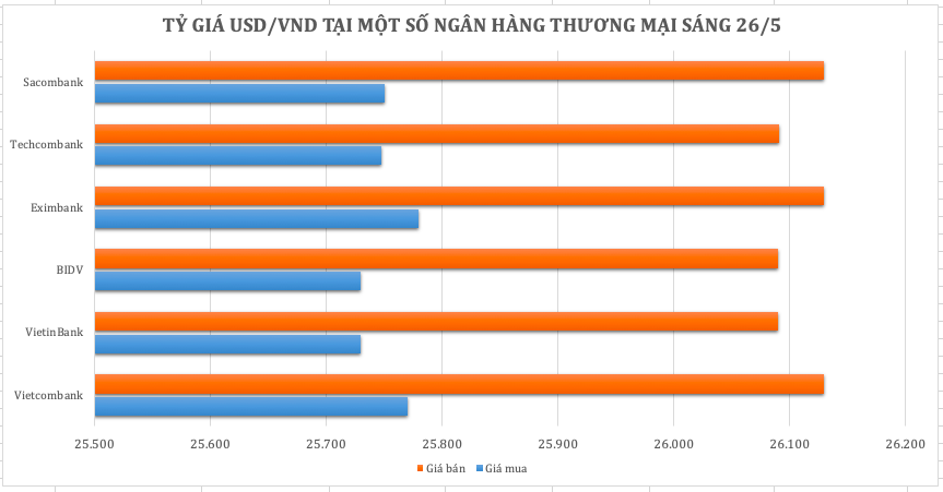 Ngân hàng Eximbank niêm yết USD ở mức 25.780 – 26.130 VND/USD, giảm 20 đồng ở hai chiều mua bán so với phiên trước đó. Tại Techcombank, giá USD được điều chỉnh giảm 62 đồng ở mỗi chiều mua bán, đang niêm yết ở mức 25.748 – 26.091 VND/USD. Sacombank niêm yết USD ở mức 25.750 – 26.130 VND/USD, giảm 25 đồng so với phiên liền trước.