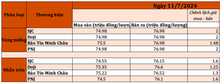 Trong khi đó, giá sản phẩm nhẫn tròn trơn tại các doanh nghiệp sáng nay đang xoay quanh mốc 74 triệu đồng/lượng chiều mua vào và 76 triệu đồng/lượng chiều bán ra.