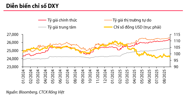 Đối với chỉ số DXY có đợt phục hồi ngắn vào cuối tháng 7 nhưng không cho thấy xu hướng đảo chiều rõ ràng. Theo VDSC, triển vọng chỉ số DXY trong thời gian tới sẽ phụ thuộc nhiều vào triển vọng cắt giảm lãi suất của Fed, thường không ủng hộ cho đà tăng giá của đồng DXY. Đây được coi là yếu tố bên ngoài thuận lợi đối với điều hành tỷ giá của NHNN.